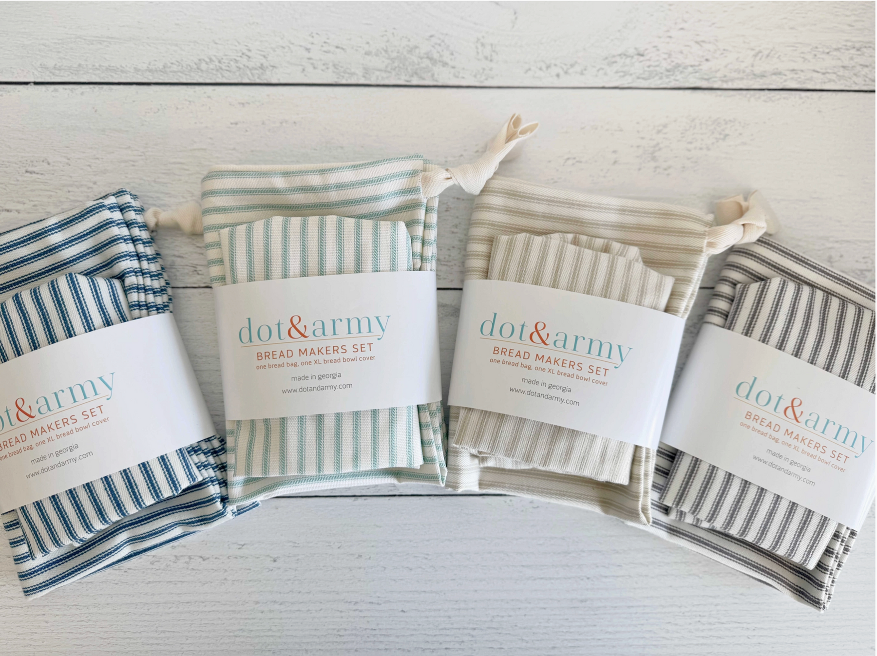 This Bread Makers Set is a simple, timeless addition to any cozy kitchen. Each set includes one reusable bowl cover and one matching bread bag, made in Georgia with durable natural fabrics. The bowl cover fits bowls up to 16 inches, perfect for rising dough, while the drawstring bread bag (12" × 16") keeps fresh loaves stored the traditional, plastic-free way.