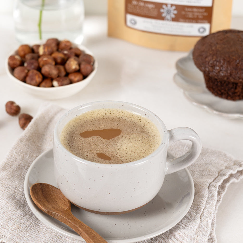 Organic Roasted Chicory Root, Organic Roasted Dandelion Root, Wild-Crafted Chaga, Organic Carob, Organic Cocoa Nibs, Oregon-Grown Hazelnuts, Organic Astragalus, Organic Maca Powder, Organic Coconut Flakes, Organic Extracts (Chocolate, Hazelnut, Coconut) Contains: Hazelnuts, Coconut