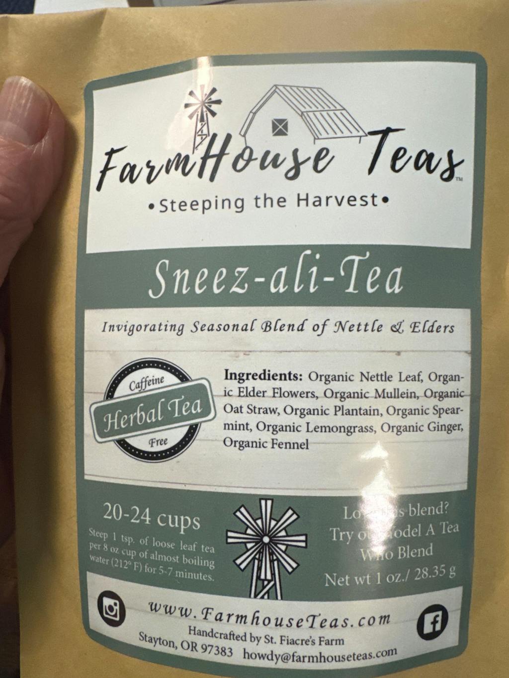 Organic Nettle, Wildcrafted Elderflower, Organic Mullein Leaf, Organic Oat Straw, Organic Plantain, Organic Spearmint, Organic Lemongrass, Organic Ginger, and Organic Fennel Seed.