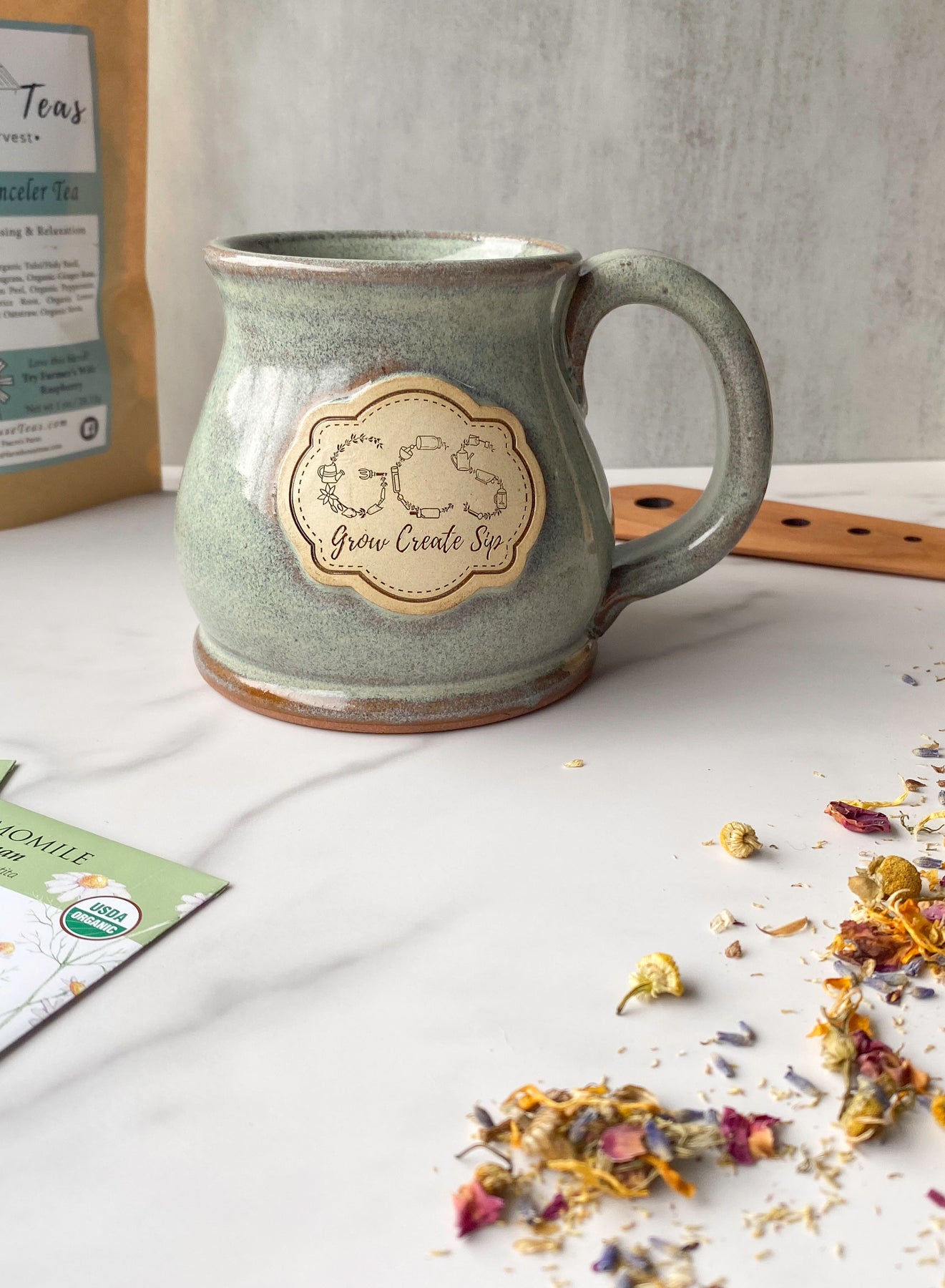 This is such a pretty and well made piece of pottery. I love the soft safe green color, and just the feel in my hands, knowing it's made in the USA. It's sentimental with the GCS logo, since I miss my home state where this tea company is located, and a collector piece to drink your warm blend of choice.